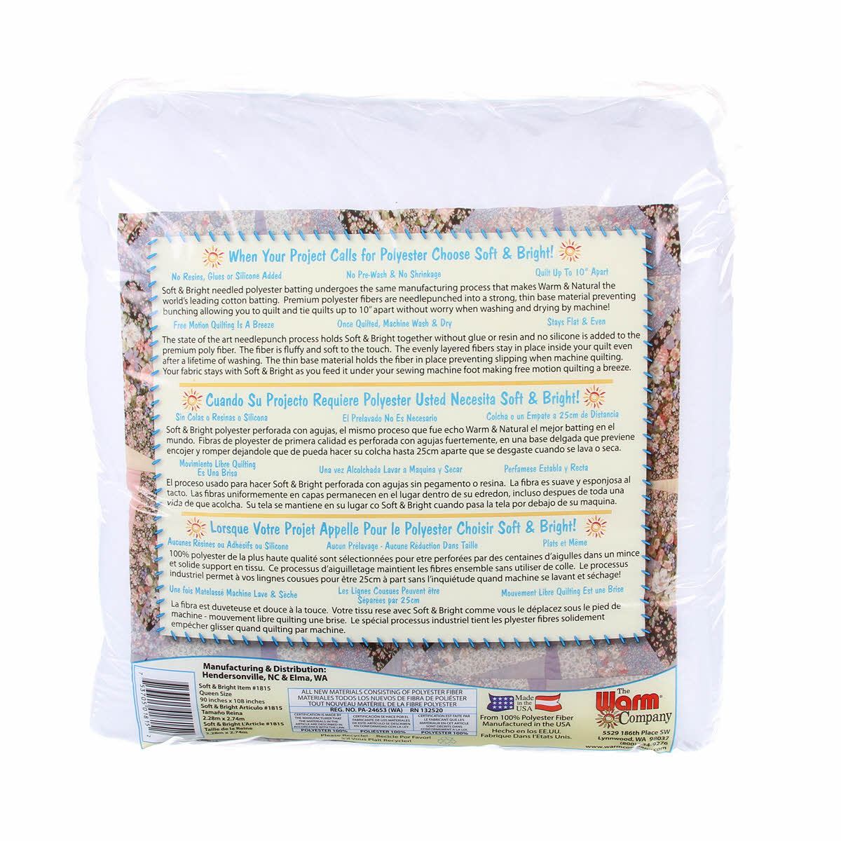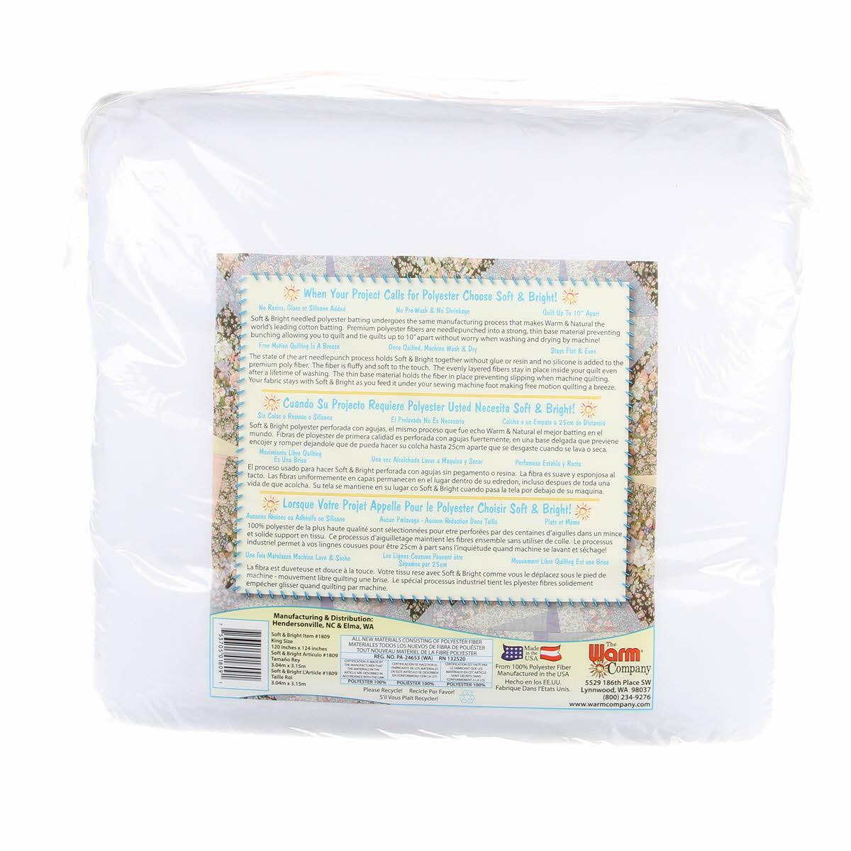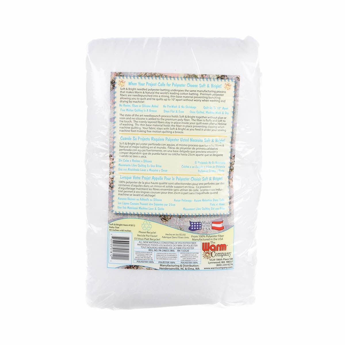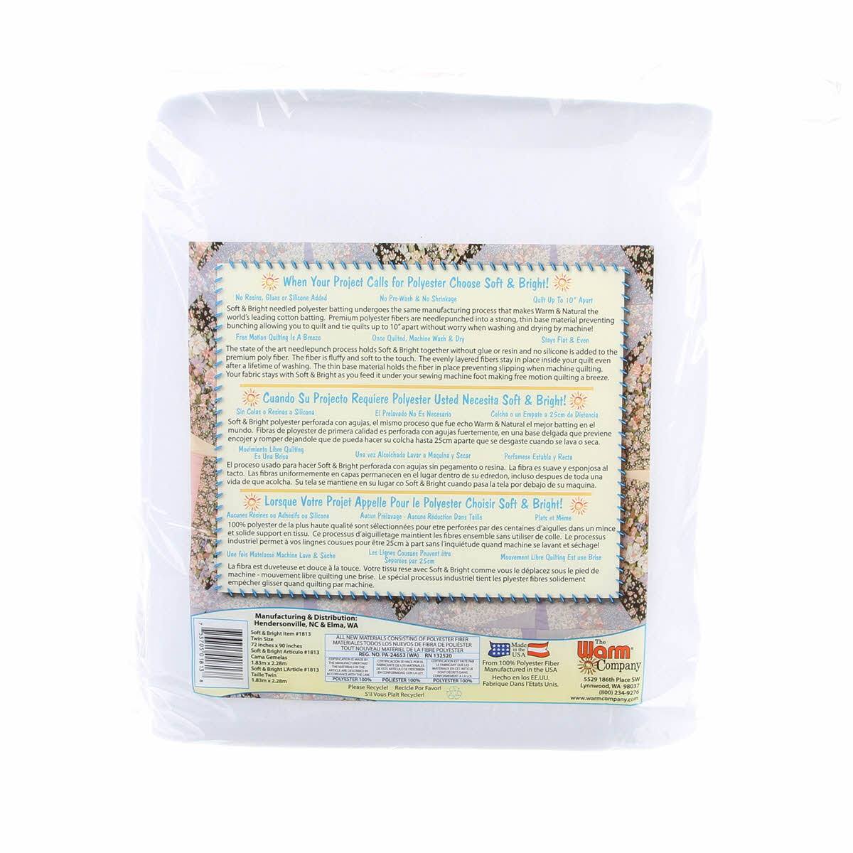 Soft & Bright is a premium grade polyester that has been needle punched to bring the fibers together into a strong and even quilt batting. This high-quality polyester is low loft (1/4" loft), soft to the touch, and adds fluff to your quilts. The fibers cling to quilt tops and backing, making free-motion quilting effortless. With Soft & Bright, you can quilt or tie up to 10 inches apart and machine wash and dry with no shrinkage. No glue, resins, or silicone are used in the making of Soft and Bright Batting. Made in the USA from 100% polyester.