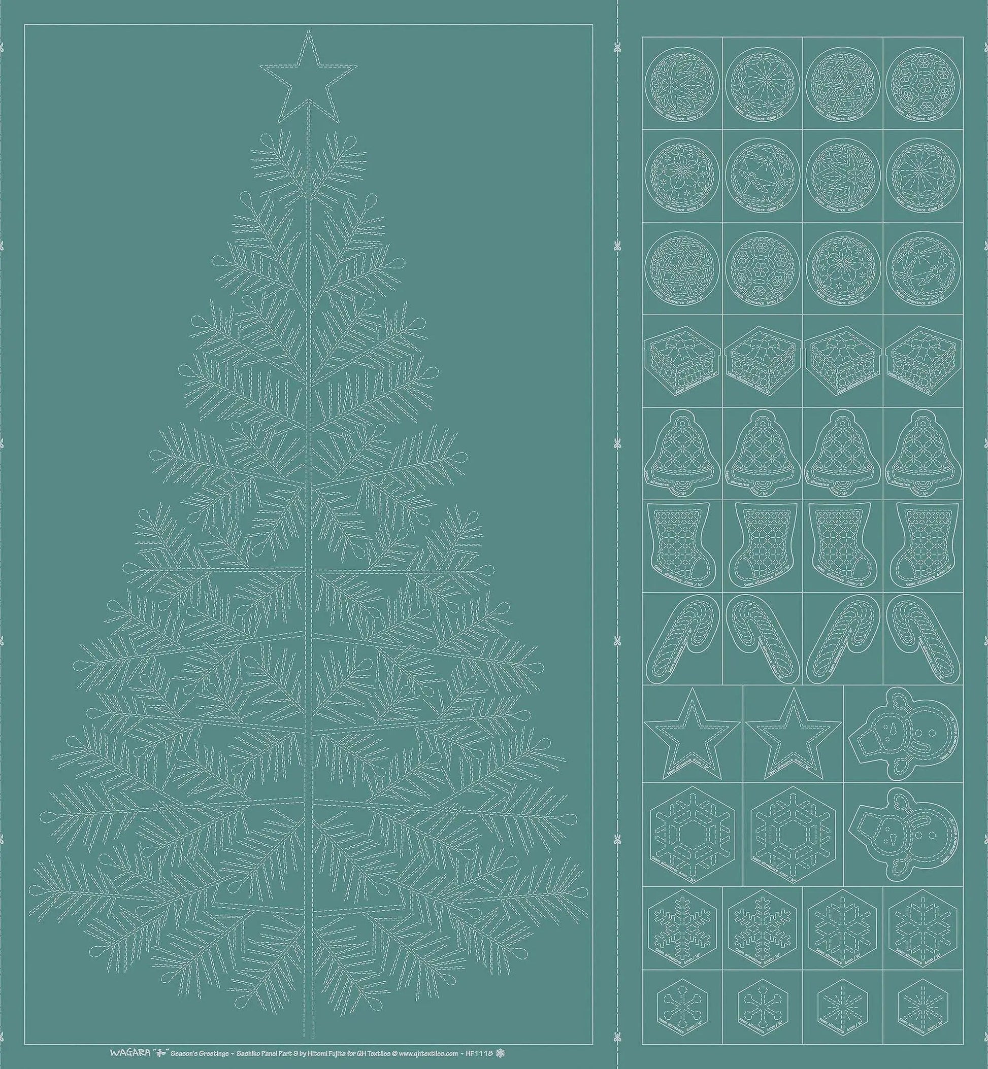 This Christmas Tree sashiko Panel with sashiko ornament as well. It's can be stitch ornament 2 pieces together put filling in that can be hang on to the tree for your idea. Designed by Hitomi Fujita for QH Textiles.