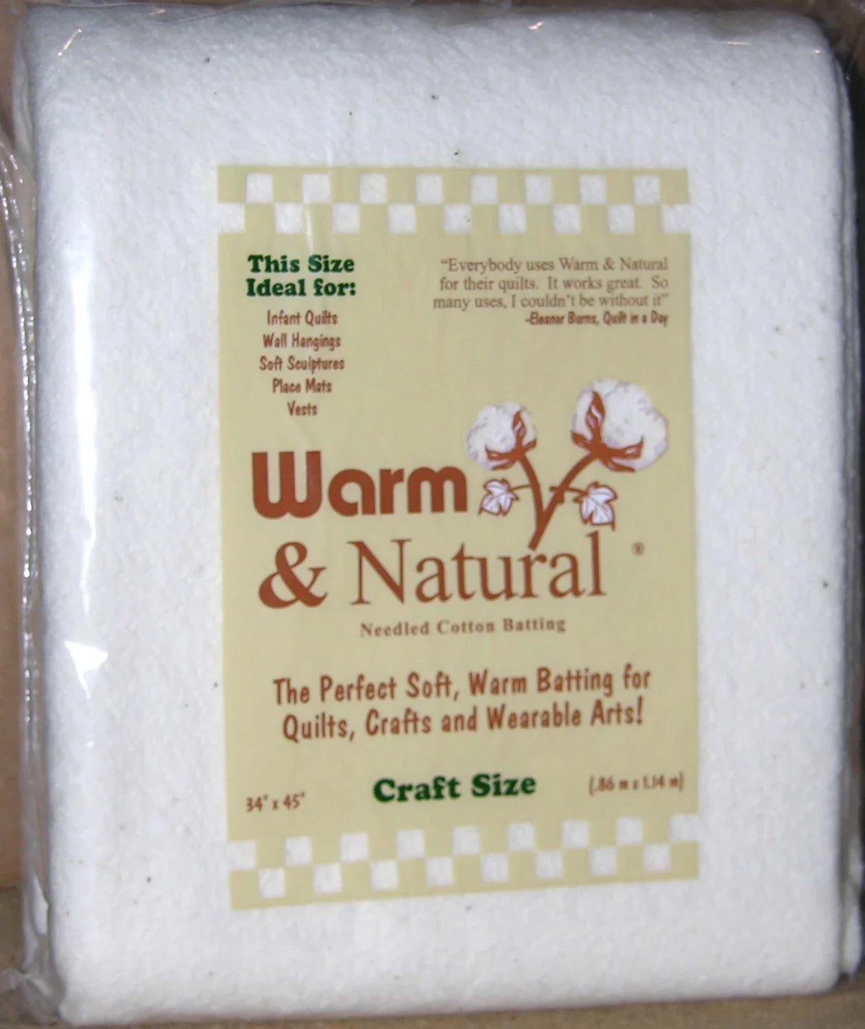 Warm & Natural Cotton Batting delivers exceptional softness, stability, and longevity—everything quilters love in a premium, non-fusible batting. Made from some of the cleanest, highest-quality cotton grown in the USA, this needle-punched, low-loft batting offers a beautifully even drape, reliable stitch hold, and that signature Warm Company durability. Because it's never washed or bleached with harsh chemicals, the batting retains its natural strength and character, making it not only environmentally mindful but also incredibly kind to your quilts. You can stitch or tie up to 10" apart, and there's no need to prewash—simply layer and sew straight from the package.